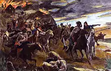 The Hunnic army set out from the Hungarian Plain and likely crossed the Rhine near Koblenz.[132] The Hunnic army included, besides Huns, the Gepids, Rugii, Sciri, Thuringi, Ostrogoths.[142] Thompson suggests that Attila's first objection was the Ripuarian Franks, whom he summarily conquered and drafted into his army.[143] They then captured Metz and Trier, before heading to besiege Orléans, with another detachment unsuccessfully attacking Paris.[132] The approach of Aetius' army, consisting of Romans and allies such as the Visigoths under their king Theodoric I, Burgundians, the Alans, and some Franks, forced the Huns to break the siege of Orléans.[144] Somewhere near Troyes, the two armies met and fought in the Battle of the Catalaunian Fields. In the standard scholarly view of the battle, despite the death of Theodoric, Attila's army was defeated and forced to retreat from Gaul.[145] Kim argues that the battle was actually a Hunnic victory: the Huns had already been leaving Gaul after a successful campaign and simply continued to do so after the battle.[146]