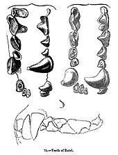 The skull greatly resembles a larger version of that of a marbled polecat.[28] The dental formula is: 3.1.3.13.1.3.1. The teeth often display signs of irregular development, with some teeth being exceptionally small, set at unusual angles or absent altogether. Honey badgers of the subspecies signata have a second lower molar on the left side of their jaws, but not the right. Although it feeds predominantly on soft foods, the honey badger's cheek teeth are often extensively worn. The canine teeth are exceptionally short for carnivores.[29] The papillae of the tongue are sharp and pointed, which assists in processing tough foods.[30]