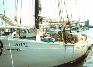 Hope is an oyster sloop that was completed in 1948. It is believed to be the last sail-powered oystering vessel built on the Long Island Sound.[1] Hope is 56 feet (17 m) long, including the bowsprit, and 42 feet 2 inches (12.9 m) at the waterline. Its beam is 15 feet 2 inches (4.6 m), and it draws 4 feet 9 inches (1.4 m) with the centerboard up. Hope is gaff rigged, 'V'-bottomed and has an 850-pound (390 kg) centerboard. Hope's shallow draft facilitated shoal water work.