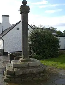 A notable remnant of this move is the village's mercat cross, which incorporates parts dating back to the 14th century. Due to the move from an original position on Kirk Road, and the fact that it incorporates a large sundial, it has been placed at an unusual angle at the centre of the 'new' village. The mercat cross has become used as a symbol for the village.[15]