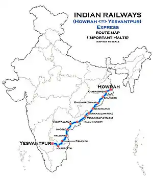 It operates as train number 22863 from Howrah Junction to Yesvantpur Junction and as train number 22864 in the reverse direction, serving the states of West Bengal, Odisha, Andhra Pradesh, Tamil Nadu & Karnataka.