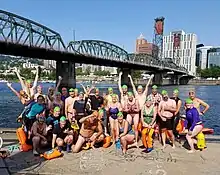 Established in 2012,[73] the River Hugger Swim Team is an open water "recreational protest swim" bringing attention to the extreme deficit of water edge access in Portland.[74] The group's goal is to swim together as a pod and create awareness to commuters and people utilizing the Eastbank Esplanade that it is safe to swim in the Willamette River.[75] In 2018, Wheeler joined nearly 40 swimmers to kick off the HAP's swim season for its River Hugger team.[76][77] In early mornings, they swim across the river. In the afternoons, when river traffic is heavier, they swim from the Hawthorne Bridge to the Morrison Bridge and back, sometimes multiple times. Each length (bridge to bridge) is roughly one third of a mile.[78]