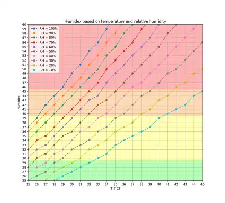 - ↑ Meteorological Service of Canada. "Humidex". Spring and Summer Weather Hazards. Environment Canada. Retrieved 20 June 2016.