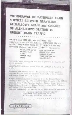 By 1906 it had become clear that Port Victoria would not develop into a major continental sea port and the South Eastern and Chatham Railway (SECR) began to look for new opportunities to bring in revenue. In July that year, seven wooden halts were constructed: Milton Road, Milton Range, Denton, Uralite, Beluncle, Middle Stoke and Grain Crossing.[2] Uralite halt was named after the nearby British Uralite Ltd complex which had opened in 1899 and manufactured drainage pipes from wet asbestos paste. On 1 May 1915, the little-used Milton Road Halt was closed.[3] The branch line to Allhallows-on-sea was opened on 16 May 1932,[4] followed on 17 July 1932 by opening of another halt at Stoke Junction.[5] A new station opened at Grain on 3 September 1951, replacing Grain Crossing Halt, which closed to rail traffic on 11 July 1951 and passengers on 3 September 1951 - a bus service being provided between those dates. The new Grain station was 300 metres (330 yd) west of Grain Crossing Halt.[6]