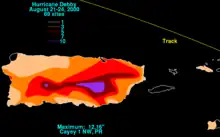 Debby also dropped up to 12 inches (300 mm) of rainfall across Puerto Rico in less than 48 hours, causing mudslides and damage to bridges and roads;[19] however, most of the island territory only received 3 inches (76 mm) of precipitation. The maximum rainfall on the island was 12.63 inches (321 mm) in Río Piedras, Puerto Rico. Additionally, 12.16 inches (309 mm) of precipitation was recorded near Cayey, though there were unofficial reports of 17 inches (430 mm) in the interior mountains of the region.[18] The hurricane dropped around 5 inches (130 mm) of rain in San Juan, producing slick roads that resulted in several minor car accidents.[18] There were 406 homes affected from the flooding, 5 of which were moderately to severely damaged. Losses in Puerto Rico reached $501,000, primarily in the Caguas municipality.[17][19] The storm was also indirectly responsible for the death of a 78-year-old man who fell while trying to remove a satellite dish from the roof of his home.[2][18][27]