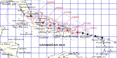 In addition, many tropical cyclone warnings and watches were posted in the Greater and Lesser Antilles. At 2100 UTC on August 20, a hurricane watch was issued for Sint Maarten, Saba, and Sint Eustatius, while there was a tropical storm watch for Antigua, Barbuda, and Anguilla. Early on August 21, the hurricane watch was expanded to include the United States Virgin Islands and Puerto Rico. Additionally, the tropical storm watch was extended out to the British Virgin Islands, Guadeloupe, Montserrat, Saint Barthélemy, Saint Kitts and Nevis, and Saint Martin. A hurricane warning was issued for Guadeloupe, Puerto Rico, and the Virgin Islands late on August 21. In Dominica, both a tropical storm warning and a hurricane watch were reported, while a tropical storm watch was put into effect in Dominican Republic. At 0300 UTC on August 22, a hurricane watch was issued for Haiti north of Port-au-Prince as was a tropical storm warning in Dominican Republic from Palenque to Cabrera. An hour later, a tropical storm watch was put into effect for the southeastern Bahamas and Turks and Caicos Islands. By 0900 UTC on August 22, Dominican Republic's entire north coast was under a hurricane warning. Additionally, the tropical storm watch for the southeastern Bahamas and Turks and Caicos Islands was upgraded to a hurricane watch.[2]