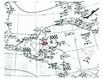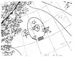 The 1943 Surprise hurricane was the first hurricane to be entered by a reconnaissance aircraft.[6] An area of low pressure was first observed over the Southeastern United States and eastern Gulf of Mexico on June 23. It tracked west-northwest and, in conjunction with surface observations along the Louisiana coastline,[7] was found to have organized into a tropical storm by 18:00 UTC on July 25 while situated about 110 mi (175 km) southeast of the Mississippi Delta. The nascent cyclone rapidly intensified thereafter, attaining hurricane intensity by 18:00 UTC on June 26 and reaching its peak as a Category 2 hurricane with winds of 105 mph (165 km/h) early the following morning. The compact hurricane moved ashore the coastline of Texas near Galveston Bay at 18:00 UTC on July 7,[8] around which time it was intercepted by the first reconnaissance aircraft to intentionally fly into a tropical cyclone.[7] The storm weakened once inland and dissipated about 60 mi (95 km/h) early of the Dallas–Fort Worth metroplex by 00:00 UTC on July 30.[8]