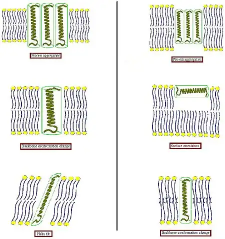 - When the hydrophobic part of a transmembrane protein is too thin to match the hydrophobic bilayer thickness (right part of Figure), again this might result in protein aggregation, or changes in backbone conformation and/or side chain orientation. Too short peptides may adopt a surface localization. Lipids could decrease the local bilayer thickness by disordering their acyl chains.