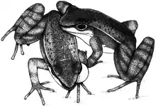 Courtship can be observed during the daytime or at night. The breeding behaviour begins with males calling near a stream, and waiting for a female to engage. Once it happens, a suitable oviposition is decided on. If the female accepts the male's offer, the latter digs up a tunnel and a chamber in the sand of the riverbed, big enough for the two frogs, in which the intercourse occurs. After oviposition, the tunnel is concealed by the male.[2]