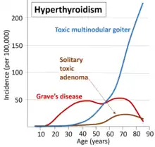 - ↑ Carlé A, Pedersen IB, Knudsen N, Perrild H, Ovesen L, Rasmussen LB, Laurberg P (May 2011). "Epidemiology of subtypes of hyperthyroidism in Denmark: a population-based study". European Journal of Endocrinology. 164 (5): 801–809. doi:10.1530/EJE-10-1155. PMID 21357288. S2CID 25049060.