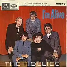 I'm Alive is the sixth British EP released by The Hollies. It was put out by Parlophone in mono with the catalogue number GEP 8942 and released in the UK in late September 1965. The EP entered the British charts on 25 September 1965 and spent 15 weeks there, peaking at #5 on the Record Retailer chart, their highest charting EP.[2]
