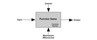 As shown by Figure 3 the position at which the arrow attaches to a box conveys the specific role of the interface. The controls enter the top of the box. The inputs, the data or objects acted upon by the operation, enter the box from the left. The outputs of the operation leave the right-hand side of the box. Mechanism arrows that provide supporting means for performing the function join (point up to) the bottom of the box.[1]