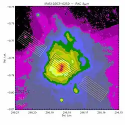 IRAS 12063-6259 is a compact H II region in the constellation of Crux. It lies at a heliocentric distance of roughly 9.5 kpc and a galactocentric distance of 9.3 kpc.[1] Although previously classified as a planetary nebula as well as an H II region, this source is now solely classified as a normal compact H II region, due to its colour criteria,[2] its infrared luminosity, and its spectral content.[3]