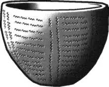 Ifri Oudadane offers insight into the first pottery of northwest Africa. Pottery in the ENA sections of the rock shelter are of Cardium variety, using horizontal and vertical bands of various impressions. Pottery from this time period is narrow, oval shaped, with a pointed base.[6] As the pottery begins to date more recently, there are two divisions during the ENB. The earlier subsection (7.1-6.9 KYA) is characterized by a closed necked(see amphora)/straight rimmed and open neck/segmented rim pottery. The later subsection of the ENB (6.8-6.3 KYA) pots are ovoid in nature with closed style with outward bending rims. Both assemblages of pottery from the ENB have decorated handles with various vertical and horizontal decoration. Later pottery from the ENB are decorated with stamps (similar to modern rubber stamps instead of individual cardium shell impressions. The pottery of the ENC occupation (6.6-6.3KYA) and the later neolithic period (≈5.7 KYA) are fairly similar. They consist of closed ovoid forms only and have similar decorations, although use of a herringbone motif is found on early neolithic only.[6]