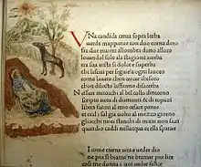 Though the majority of Petrarch's output was in Latin, the Canzoniere was written in the vernacular, a language of trade, despite Petrarch's view that Italian was less adequate for expression.[1] Of its 366 poems, the vast majority are in sonnet form (317), though the sequence contains a number of canzoni (29), sestine (9), madrigals (4), and ballate (7). Its central theme is the poet's love for Laura, a woman Petrarch allegedly met on April 6, 1327, in the Church of Sainte Claire in Avignon. Though disputed, the inscription in his copy of Virgil records this information. Petrarch's meticulous dating of his manuscripts has allowed scholars to deduce that the poems were written over a period of forty years, with the earliest dating from shortly after 1327, and the latest around 1368. The transcription and ordering of the sequence itself went on until 1374, the year of the poet's death.[2] The two sections of the sequence which are divided by Laura's death have traditionally been labelled 'In vita' (In life') and 'In morte' (In death) respectively, though Petrarch made no such distinction. His work would go on to become what Spiller calls 'the single greatest influence on the love poetry of Renaissance Europe until well into the seventeenth century'.[3]
