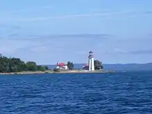 The Ile Parisienne Light Station was established on the southern tip of the Ile Parisienne[6] in 1911 after construction of the Soo Locks increased upper Great Lakes shipping traffic and the need for navigational aids.[7] The white tower is a well-known landmark to lake traffic and pleasure craft. The tower's cast-in place concrete, hexagonal structure was built with 6 tapered exterior wall buttresses, flared ribs at the platform, a gable roofed entrance, small windows, and a prominent, 10-sided, red lantern topped with a beaver weathervane.[7][8] It is considered a good example of early modern, functional design.[7]