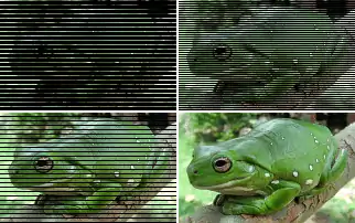 Some indexed-color image file formats such as Graphics Interchange Format (GIF) allow the image's scan lines to be arranged in interleaved fashion (not linear order), which allows a low resolution version of the image to appear on screen while it is still downloading, so that the computer user can gain an idea of its contents during the seconds before the whole image arrives. Here is an example of a typical vertically interleaved download in four steps: