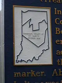 The 1795 Treaty of Greenville was the first to cede Native American land in what became the state of Indiana and made it easier for American settlers to reach territorial lands north of the Ohio River.[12] Under its terms, the American government acquired two-thirds of present-day Ohio, a small tract of land in what would become southeastern Indiana, the Wabash-Maumee portage (near the present-day site of Fort Wayne, Indiana), and early settlements at Vincennes, Ouiatenon (in present-day Tippecanoe County, Indiana, and Clark's Grant, (near present-day Clarksville, Indiana, along the Ohio River.[13] In exchange, the Indians received goods valued at $20,000 and annuity payments.[14] Most of the remaining territory, including a large portion of present-day Indiana, remained occupied by native tribes, but the tribes living along the Wabash-Maumee portage had to relocate. The Shawnee removed east to Ohio; the Delaware established villages along the White River; and the Miami at Kekionga moved to the Upper Wabash and its tributaries.[15]