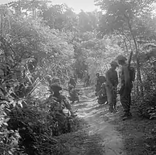 Indian and British troops move cautiously along a jungle track round the town of Gresik.