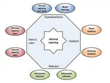 According to the Octagon Model of informal learning by Decius, Schaper, and Seifert from 2019, informal learning comprises eight components.[1] The octagon model is based on the dynamic model of informal learning by Tannenbaum et al. from 2010.[3] The dynamic model contains the four factors "experience/action", "feedback", "reflection", and "learning intention". According to the model, each factor can trigger another factor and thus precede it, but can also follow any other factor. Accordingly, the model does not contain a fixed starting or ending point, which is intended to illustrate the dynamic nature of learning. The learner may go through each factor in the informal learning process one or more times. However, the learning process is considered most efficient when all four factors are involved in it.