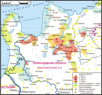 The First All-Union Census of the Soviet Union in 1926 recorded 114,831 Leningrad Finns, as Ingrian Finns were called.[2] The 1926 census also showed that the Russian population of central Ingria outnumbered the Finnic peoples living there, but Ingrian Finns formed the majority in the districts along the Finnish border.[6]