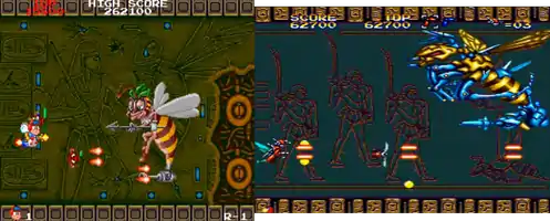 The Mega Drive version has a number of differences: "realistic" sprite work (compared to the "cute" style of the original), brand new music, a reworking of the secondary weapon system, the removal of the autofire powerup, and new stage sections, among other things. Hot-B's original design for the game was better realized on the Mega Drive, as Taito requested a more comical style of game for the original release.[1] It was published in Japan by Hot-B themselves, and in the United States by Sage's Creation.