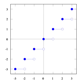 Integer-valued functions defined on the domain of all real numbers include the floor and ceiling functions, the Dirichlet function, the sign function and the Heaviside step function (except possibly at 0).
