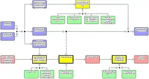 All relevant objects of an enterprise, their qualities and relations are shown in the "information model". It is class trees of the object classes "product", "order" and "resource" here. The "business process model" represents enterprise processes and their relations to each other. Activities are shown in their interaction with the objects.