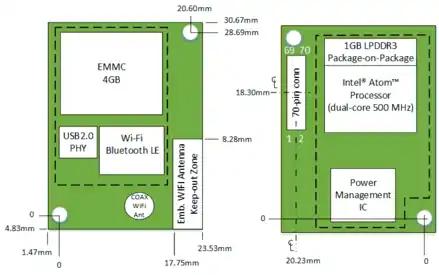 In March 2014, Intel announced changes in the Intel Edison project and the second version of the board was presented in September 2014. Its dimensions are 35.5 x 25 x 3.9 mm, with components on both sides. The board's main SoC is a 22 nm Intel Atom "Tangier" (Z34XX) that includes two Atom Silvermont cores running at 500 MHz and one Intel Quark core at 100 MHz (for executing RTOS ViperOS). The SoC has 1 GB RAM integrated on package. There is also 4 GB eMMC flash on board, Wi-Fi, Bluetooth 4 and USB controllers. The board has 70-pin dense connector (Hirose DF40) with USB, SD, UARTs, GPIOs. The price of the device is around 50 USD.[14] It runs Yocto Linux with development support for Arduino IDE, Eclipse (C, C++, Python), and Intel XDK (NodeJS, HTML5).