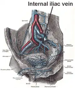 Several veins unite above the greater sciatic foramen to form the internal iliac vein. It does not have the predictable branches of the internal iliac artery but its tributaries drain the same regions.[1] The internal iliac vein emerges from above the level of the greater sciatic notch It runs backwards, upwards and towards the midline to join the external iliac vein in forming the common iliac vein in front of the sacroiliac joint. It usually lies lateral to the internal iliac artery.[2] It is wide and 3 cm long.[3]