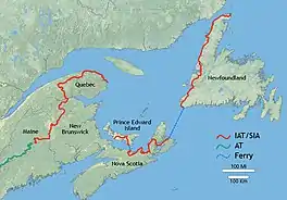 The International Appalachian Trail (IAT; French: Sentier international des Appalaches, SIA) was originally a hiking trail which ran from Katahdin Woods and Waters National Monument, in Maine, through New Brunswick, to the Gaspé Peninsula of Quebec, after which it followed a ferry route to Newfoundland, and then continued to the northern-easternmost point of the Appalachian Mountains at Belle Isle, Newfoundland and Labrador.[2] As of July 2020, there are widely geographically dispersed IAT-branded walking trails in Greenland, Iceland, Norway, Sweden, Denmark, Scotland, Northern Ireland, Ireland, Isle of Man, Wales, England, Spain, Portugal, and Morocco.[3]
