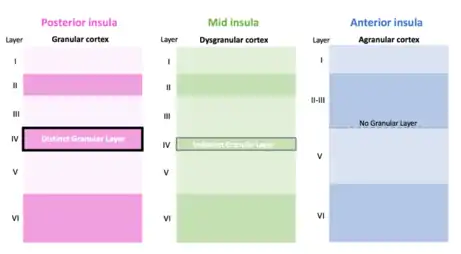 The insula contains three major subregions defined by the presence or absence of a granule cell layer: granular, dysgranular (slightly granulated) agranular. Each of these portions of the insular cortex are important for different levels of functional connectivity. Information from the thalamus is projected to all three regions. Those with increased granulation are considered to be capable of receiving sensory input.[4]