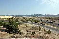 I-215 is part of the California Freeway and Expressway System,[2] and is part of the National Highway System,[3] a network of highways that are considered essential to the country's economy, defense, and mobility by the Federal Highway Administration.[4] I-215 is eligible for the State Scenic Highway System,[5] but it is not officially designated as a scenic highway by the California Department of Transportation.[6] On January 24, 1957, the State Highway Commission defined the Escondido Freeway as what is now Routes 15 and 215 from Route 805 to Route 91. This entire segment was previously Route 395 when it was named. From the SR 60 / SR 91 interchange in Riverside to I-10 near San Bernardino, the highway is known as the Riverside Freeway. From I-10 to SR 210, I-215 is known as the San Bernardino Freeway. Between Highland Avenue in San Bernardino and its northern terminus, I-215 is named the Barstow Freeway.[7] Unofficially, I-215 is known as the Armed Forces Freeway between I-15 and SR 60, given its proximity to the March Air Reserve Base.[8]