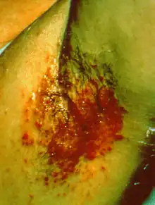 Intertrigo refers to a type of inflammatory rash (dermatitis) of the superficial skin that occurs within a person's body folds.[1] These areas are more susceptible to irritation and subsequent infection due to factors that promote skin breakdown such as moisture, friction, and exposure to bodily secretions and excreta such as sweat, urine, or feces.[1] Areas of the body which are more likely to be affected by intertrigo include the inframammary fold, intergluteal cleft, armpits, and spaces between the fingers or toes. Skin affected by intertrigo is more prone to infection than intact skin.[1]