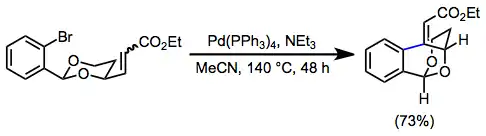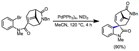 The Heck reaction is the palladium-catalyzed coupling of an aryl or alkenyl halide with an alkene to form a substituted alkene.[2] Intramolecular variants of the reaction may be used to generate cyclic products containing endo or exo double bonds. Ring sizes produced by the intramolecular Heck reaction range from four to twenty-seven atoms. Additionally, in the presence of a chiral palladium catalyst, the intramolecular Heck reaction may be used to establish tertiary or quaternary stereocenters with high enantioselectivity.[3] A number of tandem reactions, in which the intermediate alkylpalladium complex is intercepted either intra- or intermolecularly before β-hydride elimination, have also been developed.[4]
