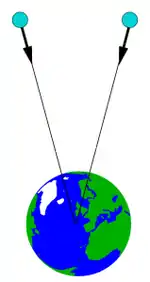 The properties of geodesics differ from those of straight lines. For example, on a plane, parallel lines never meet, but this is not so for geodesics on the surface of the Earth: for example, lines of longitude are parallel at the equator, but intersect at the poles. Analogously, the world lines of test particles in free fall are spacetime geodesics, the straightest possible lines in spacetime. But still there are crucial differences between them and the truly straight lines that can be traced out in the gravity-free spacetime of special relativity. In special relativity, parallel geodesics remain parallel. In a gravitational field with tidal effects, this will not, in general, be the case. If, for example, two bodies are initially at rest relative to each other, but are then dropped in the Earth's gravitational field, they will move towards each other as they fall towards the Earth's center.[17]
