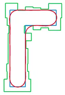 In semiconductor device fabrication, the inverse lithography technology (ILT) is an approach to photomask design. This is basically an approach to solve an inverse imaging problem: to calculate the shapes of the openings in a photomask ("source") so that the passing light produces a good approximation of the desired pattern ("target") on the illuminated material, typically a photoresist. As such, it is treated as a mathematical optimization problem of a special kind, because usually an analytical solution does not exist.[1] In conventional approaches known as the optical proximity correction (OPC) a "target" shape is augmented with carefully tuned rectangles to produce a "Manhattan shape" for the "source", as shown in the illustration. The ILT approach generates curvilinear shapes for the "source", which deliver better approximations for the "target".[2]
