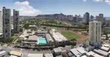 View of ʻIolani Campus with Diamond Head, Ala Wai Canal, Ala Wai Golf Course, and Waikiki in the background (circa March 10, 2010). Note: this photo is missing a number of newly constructed buildings.