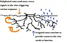 One irrigation technique known as partial rootzone drying (or PRD) involves "tricking" the grapevine into thinking it is undergoing water stress when it is actually receiving sufficient water supply. This is accomplished by alternating drip irrigation to where only one side of the grapevine receives water at a time. The roots on the dry side of the vine produce abscisic acid that triggers some of the vine's physiological responses to water stress - reduced shoot growth, smaller berries size, etc. But because the vine is still receiving water on the other side the stress doesn't become so severe to where vital functions such as photosynthesis is compromised.[14] Partial rootzone drying has been shown to significantly increase a vine's water use efficiency. While PRD is shown to slightly reduce leaf area, this is generally not a problem as overall yield is unaffected.[15]