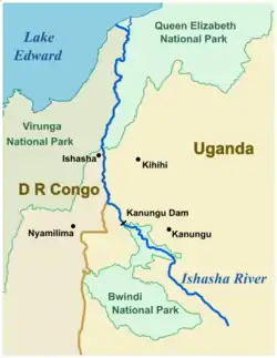 The Ishasha is a river in southwest Uganda, forming part of the border with the Democratic Republic of the Congo. It runs from its source north of Kabale to its mouth at Lake Edward.[1][2] Its length is very roughly 100 kilometres (62 mi) ignoring the many small meanders.