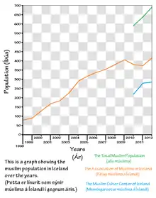 Islam in Iceland is a minority religion. The Pew Research Center estimated that the number of Muslims in Iceland was below its 10,000 minimum threshold, and official statistics put the figure at under 1,300, or 0.33% out of the total population of 385,230.[2][3]