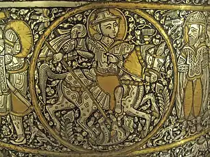 Islamic metalwork includes some three-dimensional animal figures, such as fountainheads or aquamaniles, but only one significant enamelled object of Byzantine cloisonné technique is known.[45] The Pisa Griffin is the largest surviving bronze animal, probably from 11th century al-Andaluz. More common objects with elaborate decoration include massive low candlesticks and lamp-stands, lantern lights, bowls, dishes, basins, buckets (these probably for the bath),[46] and ewers, as well as caskets, pen-cases and plaques. Ewers and basins were brought for hand-washing before and after each meal, and so are often lavishly treated display pieces. A typical 13th century ewer from Khorasan is decorated with foliage, animals and the Signs of the Zodiac in silver and copper, and carries a blessing.[47] Specialized objects include knives, arms and armour (always of high interest to the elite) and scientific instruments such as astrolabes, as well as jewellery. Decoration is typically densely packed and very often includes arabesques and calligraphy, sometimes naming an owner and giving a date.[48]