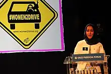 One of such controversial interpretations involve passages in the Quran that discuss the idea of a man's religious obligation to support women.[65] Some scholars, such as anthropologist Carolyn Fluehr-Lobban in her work on Arab-Muslim women activists' engagement in secular religious movements, argue that this assertion of a religious obligation "has traditionally been used as a rationale for the social practice of male authority."[65] In some countries the legislative and administrative application of male authority is used to justify denying women access to the public sphere through the "denial of permission to travel or work outside the home, or even drive a car."[65] On Sept. 26, 2017 Saudi Arabia announced it would end its longstanding policy banning women from driving in June 2018.[66] Various female activists had protested the ban, among them Saudi women's rights activists Manal al-Sharif,[67] by posting videos of them driving on social media platforms. One of the women's rights activists from Saudi Arabia, Loujain al-Hathloul had been imprisoned for more than 3 years and was sentenced on 28 December 2020 to a total of 5 years and 8 months in prison for allegedly conspiring against the kingdom in alignment with foreign nations following her protest against the ban on driving for women in Saudi. Two years and ten months of her prison sentence was reduced leaving only 3 months of time left to serve. However, the charges against her were false and the authorities denied arresting her for protesting against driving ban on women in Saudi Arabia. The prosecutors who were charged with torturing her during detention; sexually and otherwise, were cleared of charges by the government stating lack of evidence.[68]