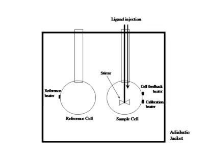 An isothermal titration calorimeter is composed of two identical cells made of a highly efficient thermally conducting and chemically inert material such as Hastelloy alloy or gold, surrounded by an adiabatic jacket.[1][7] Sensitive thermopile/thermocouple circuits are used to detect temperature differences between the reference cell (filled with buffer or water) and the sample cell containing the macromolecule. Prior to addition of ligand, a constant power (<1 mW) is applied to the reference cell. This directs a feedback circuit, activating a heater located on the sample cell.[6] During the experiment, ligand is titrated into the sample cell in precisely known aliquots, causing heat to be either taken up or evolved (depending on the nature of the reaction). Measurements consist of the time-dependent input of power required to maintain equal temperatures between the sample and reference cells.[5]
