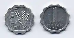This name was used for the first time in 1960, when the Israeli government decided to change the subdivision of the Israeli pound (Hebrew: לירה, lira) from 1,000 prutah to 100 agorot due to the currency's depreciation.[2] The name was suggested by the Academy of the Hebrew Language, and was borrowed from the Hebrew Bible: