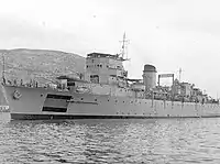 Marte was the last minelayer of the class to be commissioned before the end of the civil war. Neptuno, the last of the batch, was not completed until November 1939, seven months after the war was over.[29] Marte was released to the Nationalist navy on 11 November 1938. The minelayer departed from El Ferrol in December 1938 to take part in the chase of the Republican destroyer José Luis Díez, which had taken shelter in Gibraltar. Given the inexperience of her crew, Marte didn't play any major role in the neutralization of the Republican warship. Later, in January 1939, while based at the port of Palma, Marte participated in gunnery trials off Majorca and in blockade activities along the Catalan coast and the Gulf of Lion. In February, she relieved her sister Júpiter from her blockade duties off Catalonia, and on 21 February she attended a naval parade at Salou. On 7 March 1939, during the ill-fated landing on Cartagena, Marte loaded troops and cargo at Castellon before the operation was cancelled.[30] Along with her sisters, she patrolled the Republican waters off Alicante in the waning days of the war. Marte took part in one of the last international maritime incidents of the war on 19 March 1939, when she prevented the British steamer Stanbrook from entering Alicante. The ship, chartered by the Republican government, went back to Oran, Algeria.[31][32] The Stanbrook eventually reached the Spanish port on 27 March,[33] after the Nationalist side displayed some indulgency toward the evacuation of refugees in return for the British recognition of Franco's legitimacy.[34] Two days later, Stanbrook left Alicante bound for Oran, crowded with at least 2,000 people, one of the last ships to either enter or flee Republican Spain. Her Welsh skipper, Captain Archibald Dickson, later killed during the sinking of his ship in World War II, is today remembered as a hero in Alicante.[35]