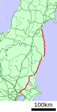 The Jōban Line (Japanese: 常磐線, Hepburn: Jōban-sen) is a railway line in Japan operated by the East Japan Railway Company (JR East). The line officially begins at Nippori Station in Arakawa, Tokyo before the line officially ends at Iwanuma Station in Iwanuma, Miyagi.[1] However, following the opening of the Ueno–Tokyo Line, Jōban Line train services originate at Shinagawa or Ueno; likewise, Jōban Line trains continue past Iwanuma onto the Tōhoku Main Line tracks to Sendai.[2] The line approximately parallels the Pacific coasts of Chiba, Ibaraki, and Fukushima Prefectures.