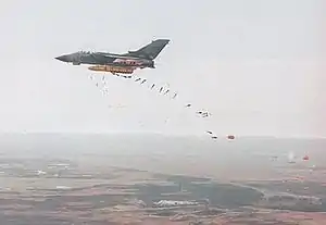 What alarmed the crews of British and Saudi Arabian Tornados using JP233 was that the aircraft was brightly illuminated at night by the exploding munitions.[5] Attacks using JP233 were suspended six days into the Gulf War, as the Iraqi Air Force was effectively flying no missions.
