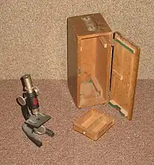 SEL Student's Microscope with wooden box containing a drawer for glass slides. Other accessories are missing.