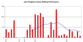 Jack Fingleton's Test career batting performance. The red bars indicate the runs that he scored in an innings, with the blue line indicating the batting average in his last ten innings. The blue dots indicate an innings where he remained not out.[20]